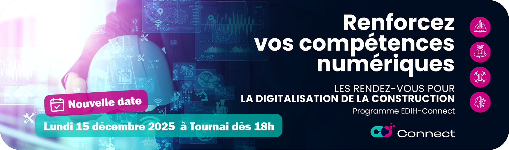 Suite au succès de la soirée eDIH-Connect organisée à Mons, qui a rassemblé près d’une quarantaine de professionnels du secteur, le CeREF Technique, en collaboration avec les partenaires du projet européen eDIH-Connect, a le plaisir de proposer une nouvelle édition à Tournai, consacrée à la digitalisation du secteur de la construction, le lundi 15 décembre 2025 dès 18h00, sur le campus HELHa (rue Frinoise 12).